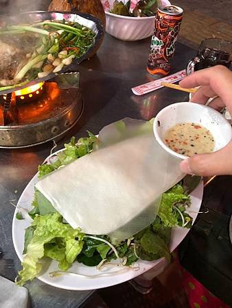 我是直接把那個像紙一樣的東西,包上底下的生菜,然後沾很臭的魚露吃,