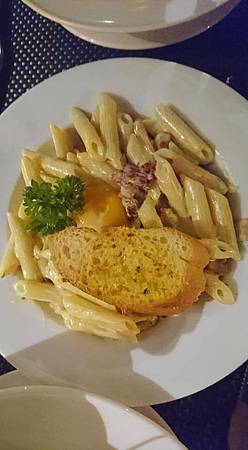 今天點的是奶油培根蛋黃義大利麵,醬汁很濃郁,麵條軟硬也蠻適中的,