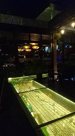 餐廳的地板設計也很美,透明的玻璃底下鋪著白沙與貝殼,再打上燈光就很有味道