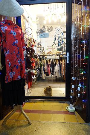 服飾店,店門口有一隻狗狗很堅持要趴那裡,