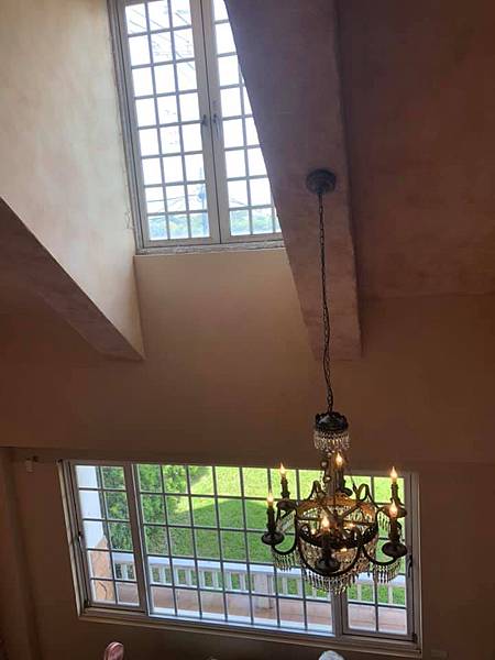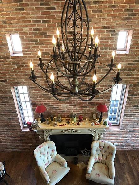 吊燈、斜屋頂、格子窗戶,搭配著戶外綠油油的草地拍照起來好美麗
