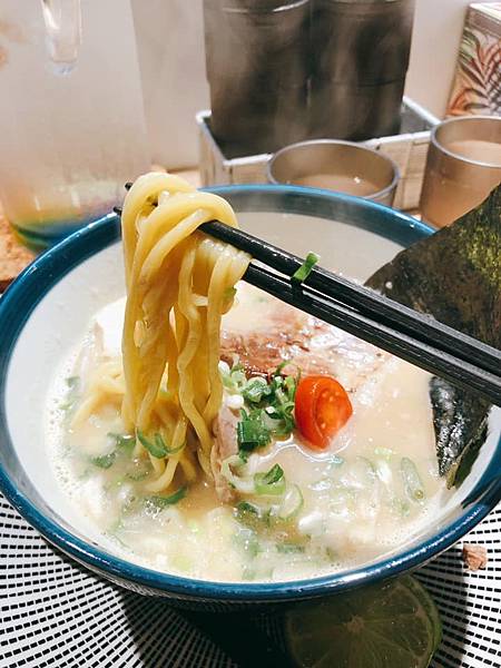 拉麵的湯頭超級超級濃郁的,而且還帶了一股淡淡的不會讓人討厭的中藥味,湯頭喝起來是濃郁的豬大骨湯,不過沒有那種很臭的豬腥味,一開始喝會覺得湯頭很棒,一口接一口一直喝湯,不過因為湯頭太濃郁了,所以會覺得越喝越鹹,口味比較重,需要配很多白開水才有辦法解膩,還好桌上就有冰開水,冰開水內還有丟檸檬片,很解膩