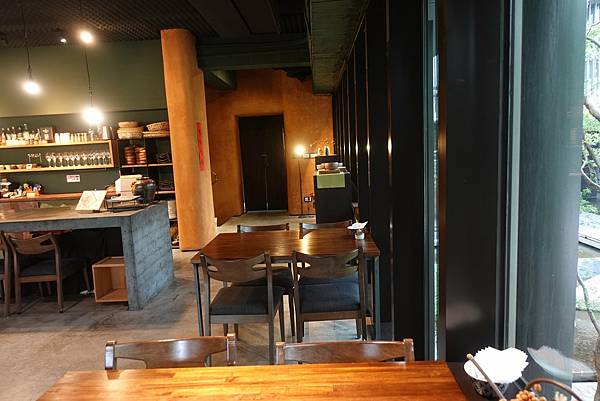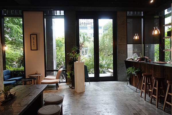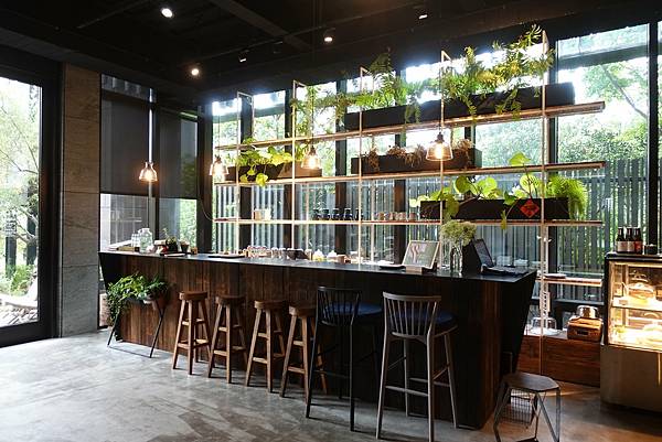 充滿綠色植栽的櫃台,將窗外的綠也裝進室內了,也更為泥作的室內空間增添一些生氣