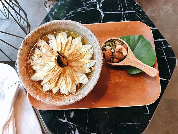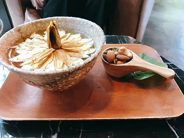 將一朵蓮花直接放入碗中沖泡成茶,清新淡雅的茶香,光是用聞的都能讓人心神安定下來,每個碗茶旁都附有一小匙的堅果,以及搭配上一抹綠葉,很喜歡這樣的擺盤阿~同行友人點的是台茶十八號紅茶($230)以及三峽柑仔白茶($260),碗茶皆可回沖熱水