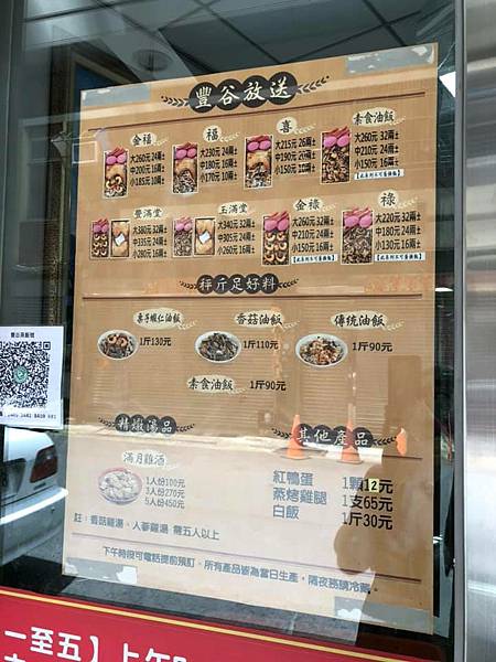豐谷油飯共有四種口味:傳統油飯、香菇油飯、蝦仁油飯以及素食油飯,可以購買禮盒的搭配也可以直接秤重購買,另外紅蛋以及雞腿也都可以單買,各種組合搭配都非常彈性,想吃什麼買什麼,是能夠客製化的油飯。