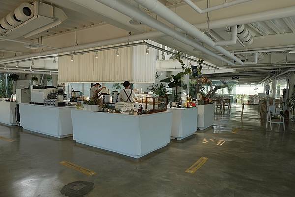 位於餐廳正中間的櫃台一樣也是純白色的,櫃台上方是中空的設計,讓光線可以直接灑落而下,也是餐廳內的一個亮點。