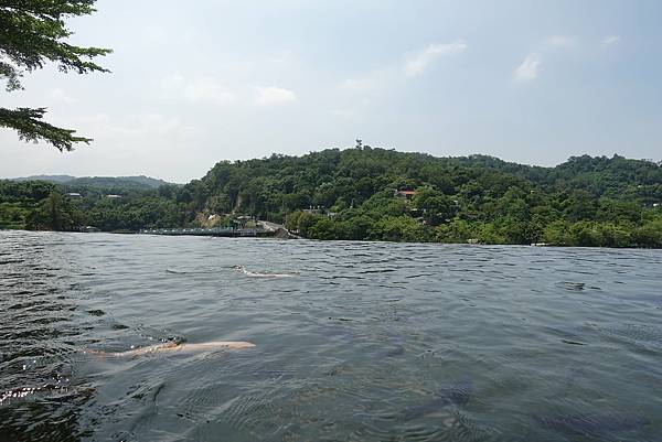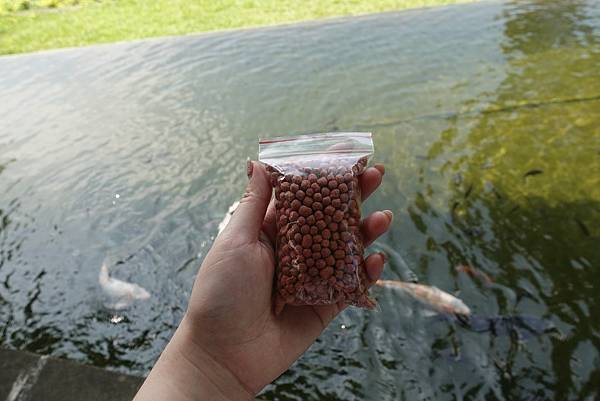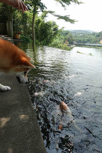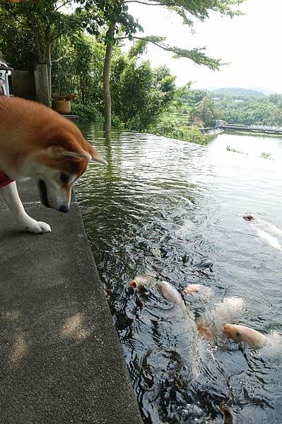 爸媽餵魚,MIBO也在水池邊看著魚群搶食飼料,偶爾會被一躍而起偌大的魚嘴巴嚇得直接往後退好幾步,很逗趣~