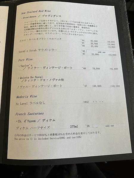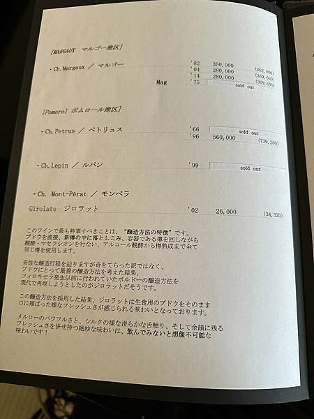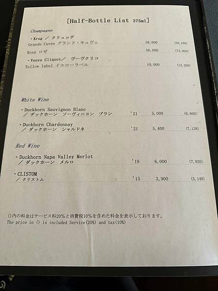 吉兆的酒單超級厲害也超級豐富,除了紅酒、白酒、香檳以外,清酒也有好幾種可以選擇:黑龍月份限定酒、十四代 本丸、岩 IWA 5,更有年份酒,如Cuvée Louise、黑龍無二。