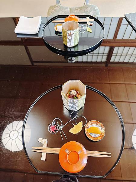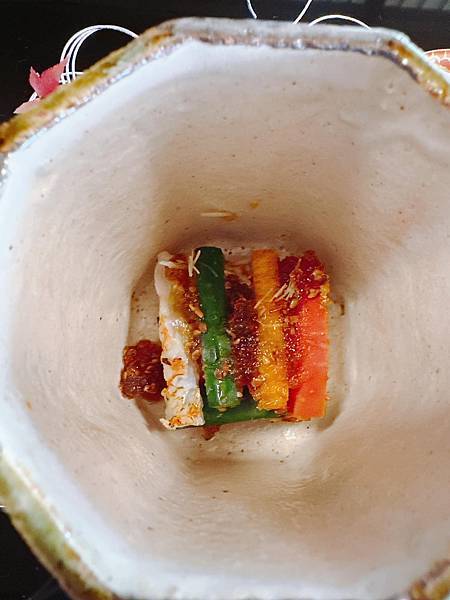 接著上場的是今天最漂亮的一道料理,將京都嵐山的秋意全部都濃縮在這一個托盤之上,將料理用精美造型的容器盛裝著,是場視覺、味覺、嗅覺都兼具的饗宴。